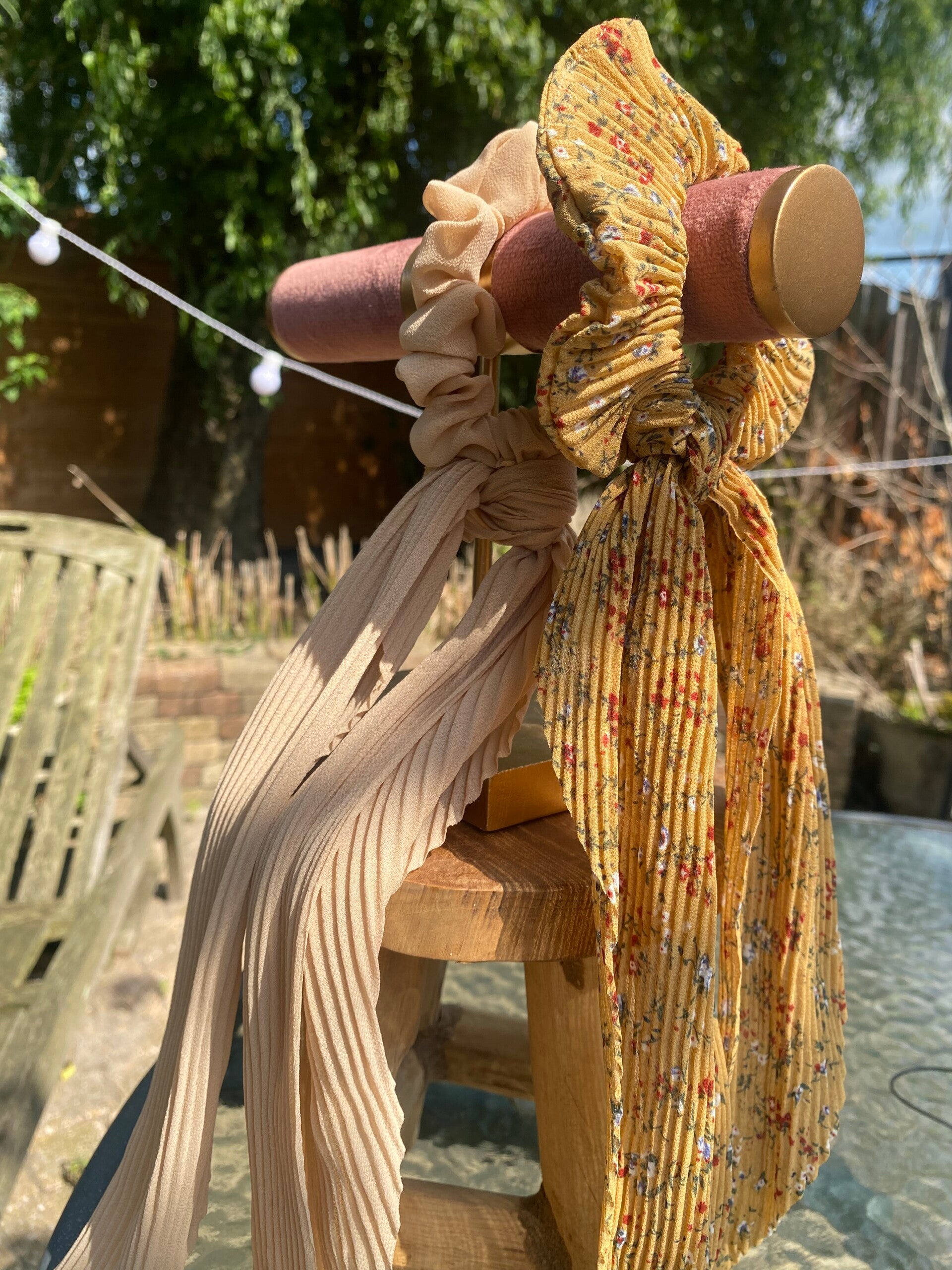Scrunchie met flared effect om leuk te laten hangen of strikjes mee te maken. In de kleuren beige en caramel met printje.